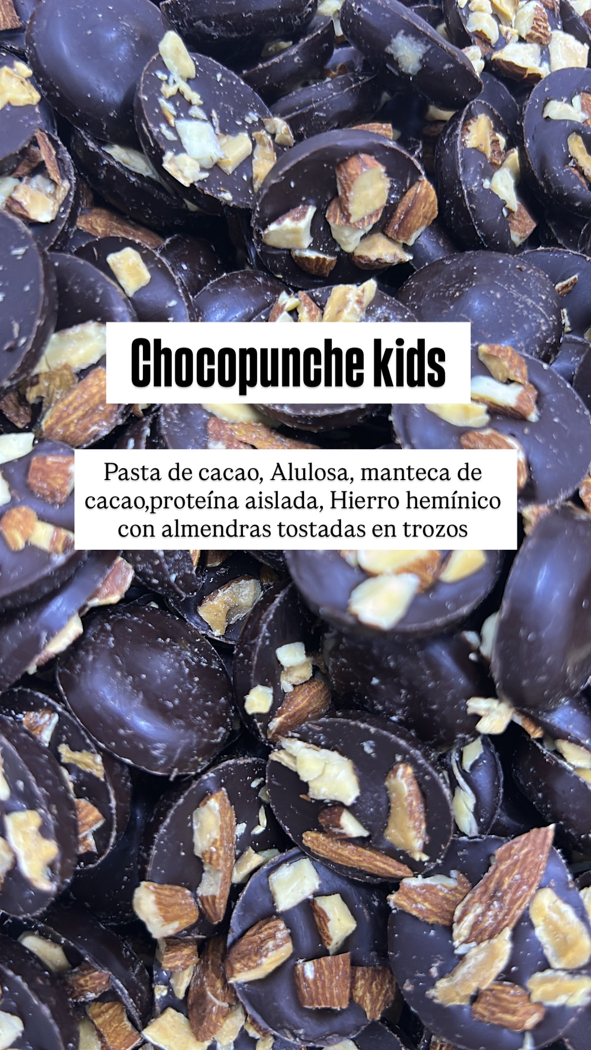 Pasta de cacao, Alulosa, manteca de cacao,proteína aislada, Hierro hemínico, almendras tostadas en trozos.