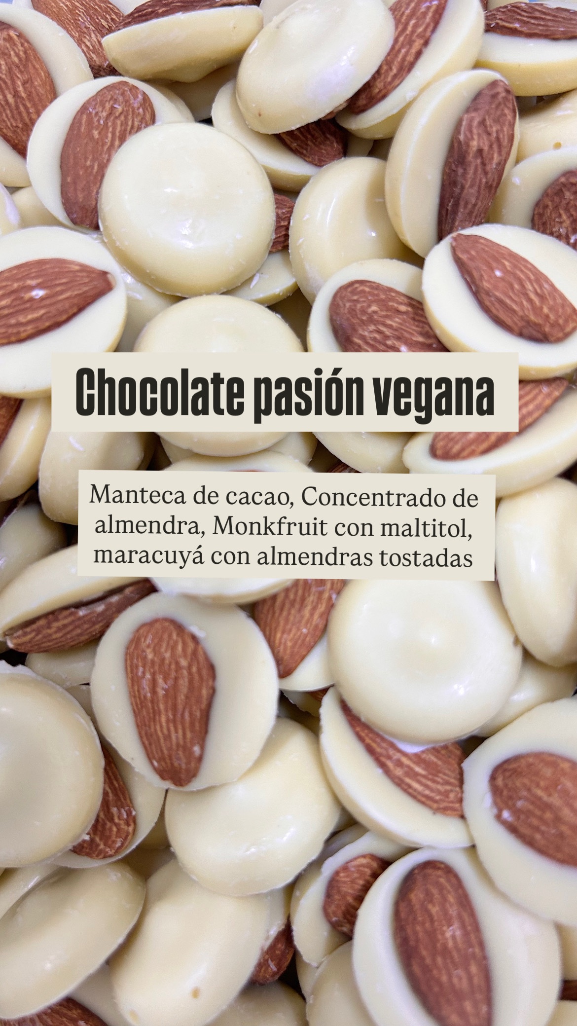 Manteca de cacao, Concentrado de almendra, Monkfruit con maltitol, maracuyá, almendras tostadas.